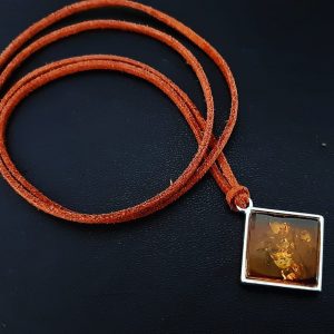 Gintaro pakabukas ant odinės virvelės
