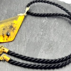 Puikus gintaro pakabukas ant juodos virvės