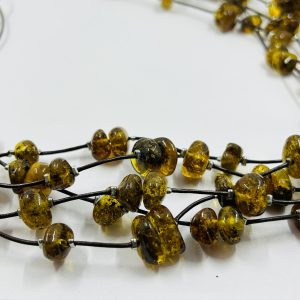 Vėrinys iš rudos odos, panaudoti žali natūralūs Baltijos gintaro akmenys