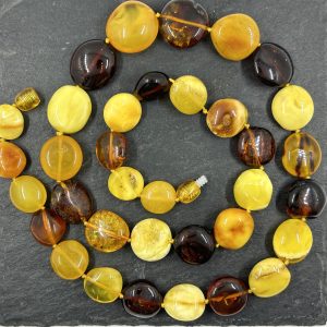 Natūralaus Baltijos gintaro karoliai, sukurti ant nailono siūlų, tarp kiekvieno gintaro surišti mazgai